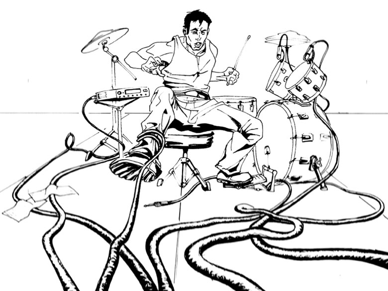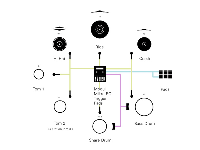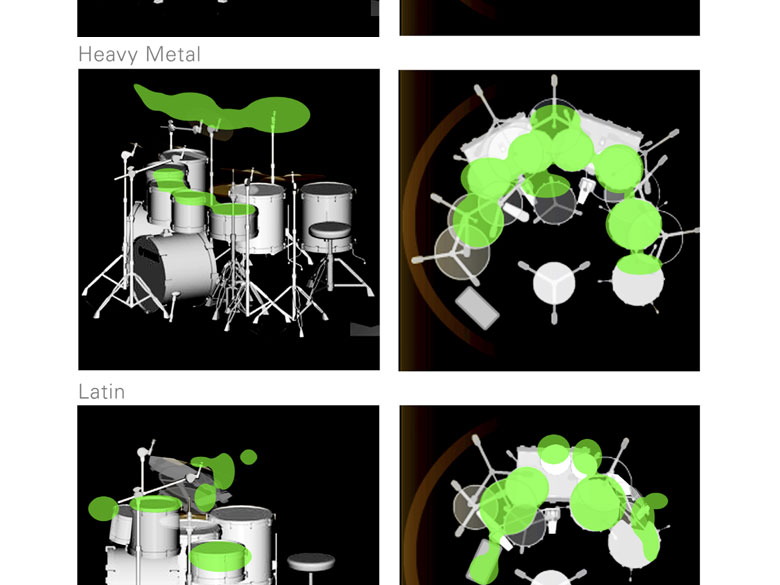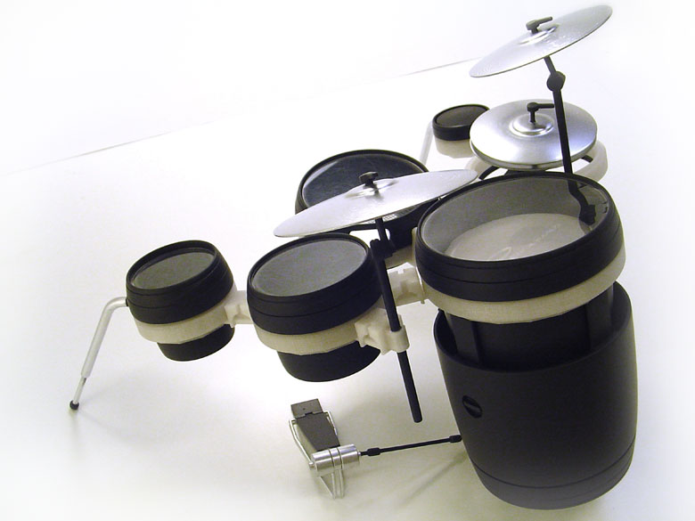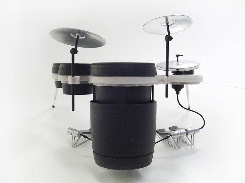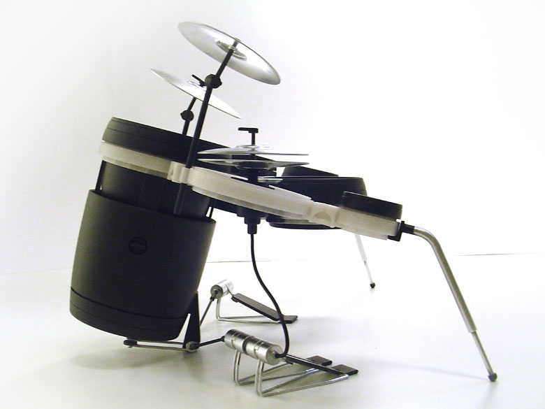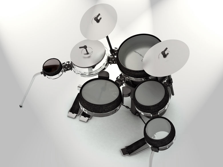 Tamburo Schlagzeug System – Tamburo Drum Set. Großes Packmaß, lange Aufbauzeiten, komplizierte Handhabung. Das schreckt viele Schlagzeugeinsteiger ab und kann selbst professionelle Studiomusiker behindern. Die Konzeptstudie Tamburo entledigt sich der Nachteile des klassischen Schlagzeugs und adaptiert die Vorteile der elektronischen Klangwelt.