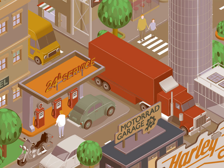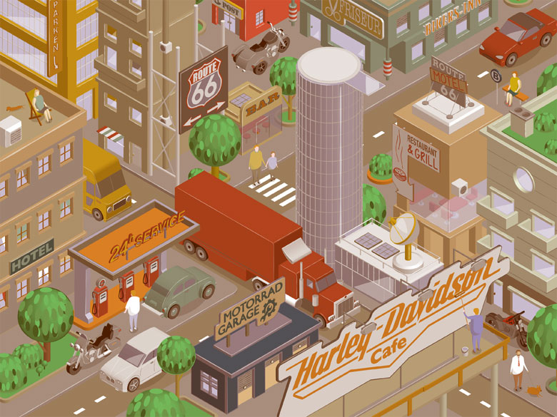 Wimmelbild. Illustration einer Stadtszene mit Suchfunktion für ein Gewinnspiel.
